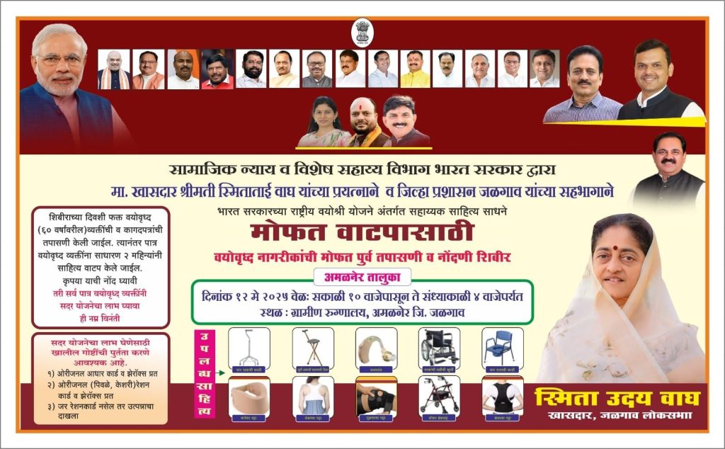 अमळनेर |अटकाव न्यूज: भारत सरकारच्या सामाजिक न्याय व विशेष सहाय्य विभागाच्या वतीने, खासदार श्रीमती स्मिताताई वाघ यांच्या प्रयत्नाने आणि जिल्हा प्रशासन जळगाव यांच्या सहकार्याने अमळनेर तालुक्यातील ज्येष्ठ नागरिकांसाठी मोफत साहित्य वाटप व नोंदणी शिबिराचे आयोजन करण्यात आले आहे.