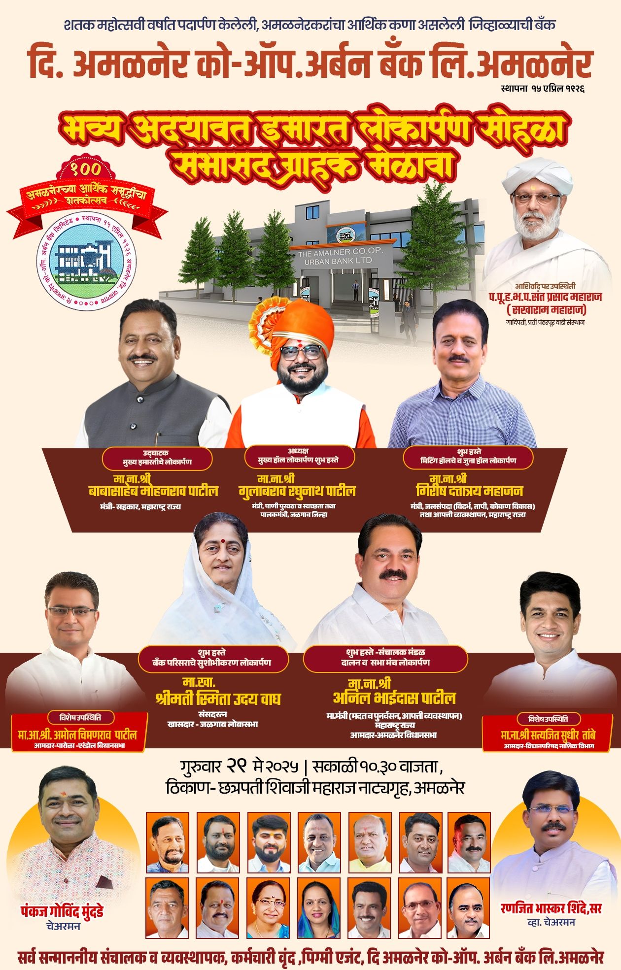 अमळनेर को.ऑप. अर्बन बँकेच्या शतकमहोत्सवी वर्षानिमित्त एक भव्य सभासद-ग्राहक मेळावा व नूतनीकरण केलेल्या इमारतीचे लोकार्पण सोहळा छत्रपती शिवाजी महाराज नाट्यगृह, अमळनेर येथे दिनांक २९ मे २०२५ रोजी सकाळी ११ वाजता संपन्न होणार आहे.